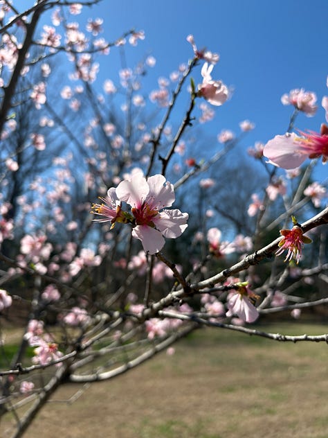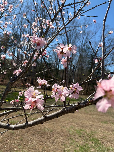 As I was saying, spring arrived. And one of my favorite things about spring is that the almond tree on the grounds of the church that I pastor is now blooming. This tree was planted in 2018 by some friends who heard my longing for such a tree after preaching a series on Jeremiah. Our church’s almond tree first bloomed in March of 2020. I cannot tell you how timely that was for me. As we entered the Covid pandemic, I was able to see a living picture of the Lord’s promise of presence and faithfulness. That tree has been preaching to me through the seasons ever since. I highly recommend getting one for yourself.